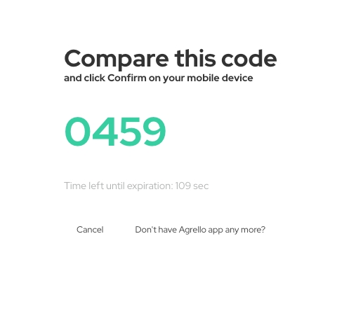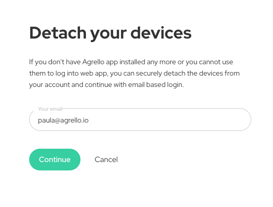 Usually when you have Agrello mobile app and you want to log in to web app, then you need to confirm authentication with your mobile app. If you don’t have access to your mobile app anymore, then you can detach the old device during log in by clicking on the “Don’t have Agrello app any more”?