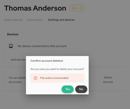 When you click on the Delete Account button, the confirmation popup is displayed. Click Yes on the confirmation popup to delete your account.