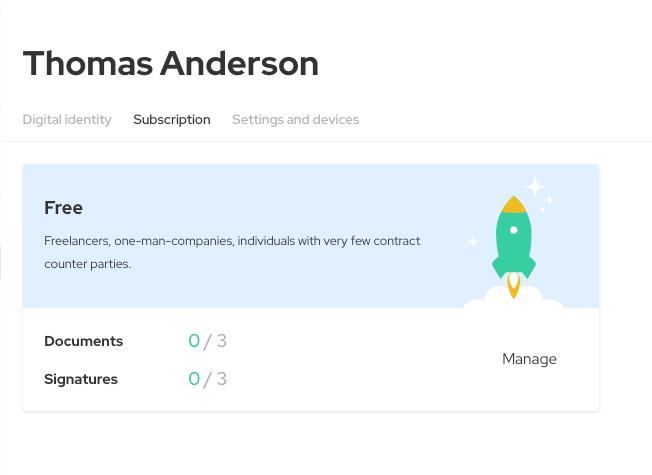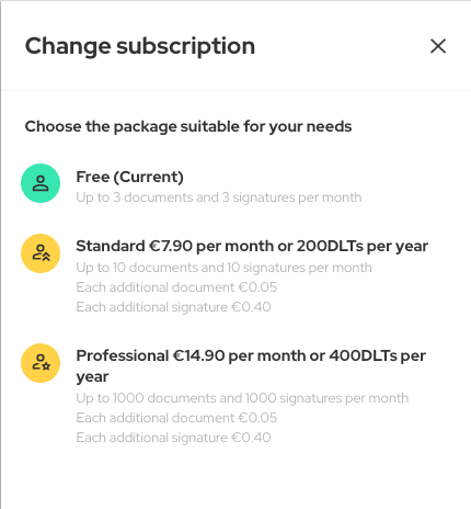 On web app you can subscribe with credit card or using Agrello DLT’s. At Agrello we provide users a Free plan, that contains 3 documents and 3 signatures per month. If you reach that limit, it’s time to upgrade your subscription plan.