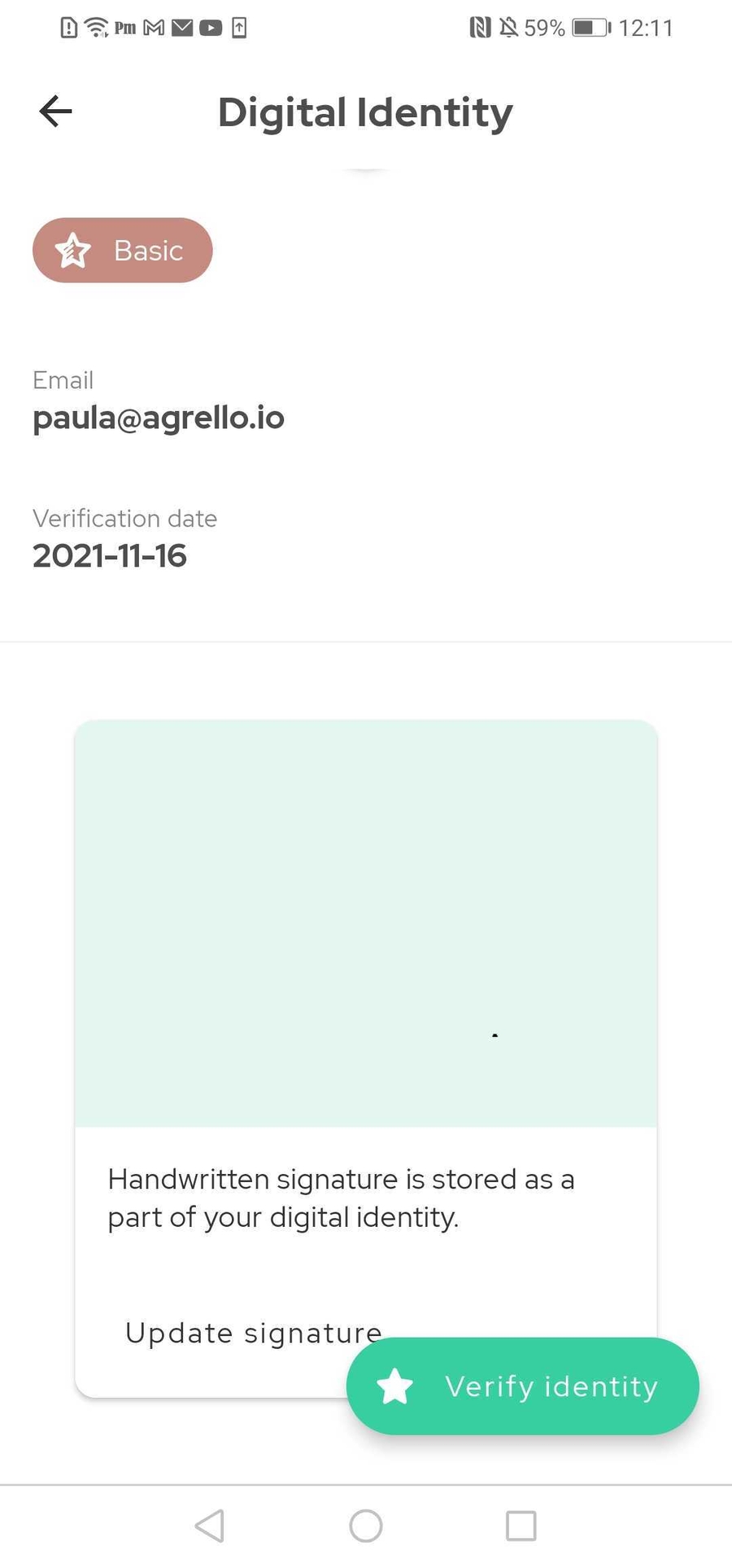 Agrello gives you an opportunity to add your handwritten signature to your digital identity. Visual signature should be created before signing the first document.