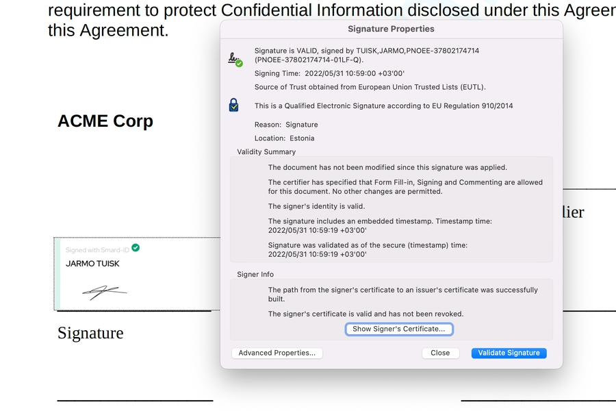 First of all, using PDF document format makes it simpler for you to define where the signature visual appearances will be. You don’t need to designate the signature places with specific {{sig_}}-tags anymore. Simply open the file in editing mode and just draw where you want to put the signatures. Secondly, now the Qualified Electronic Signatures given with Smart-ID or Mobile-ID are also natively supported inside the PDF file. It will give you the possibility to meet the highest electronic signing standards. Finally, if you choose ASIC document type, the signers can only sign with Qualified Electronic Signatures, so you do not need to remind your signers to choose the highest security electronic signature format. How to validate PDF signatures?