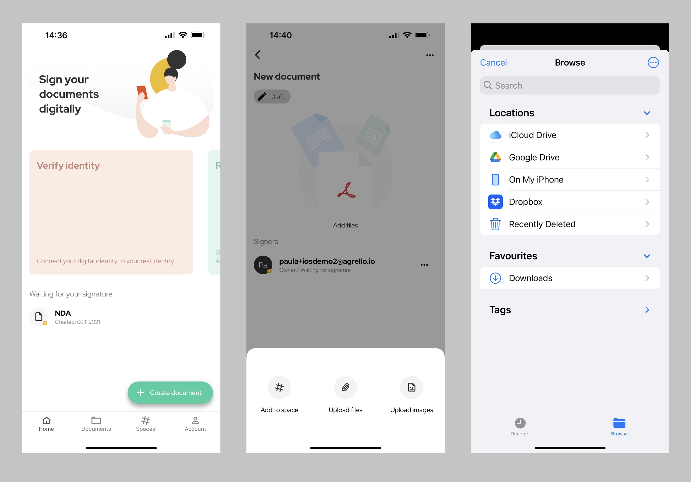 Browse resources on your iOS device and upload files you want to get signed from iCloud Drive, Google Drive, Dropbox, your phone etc.