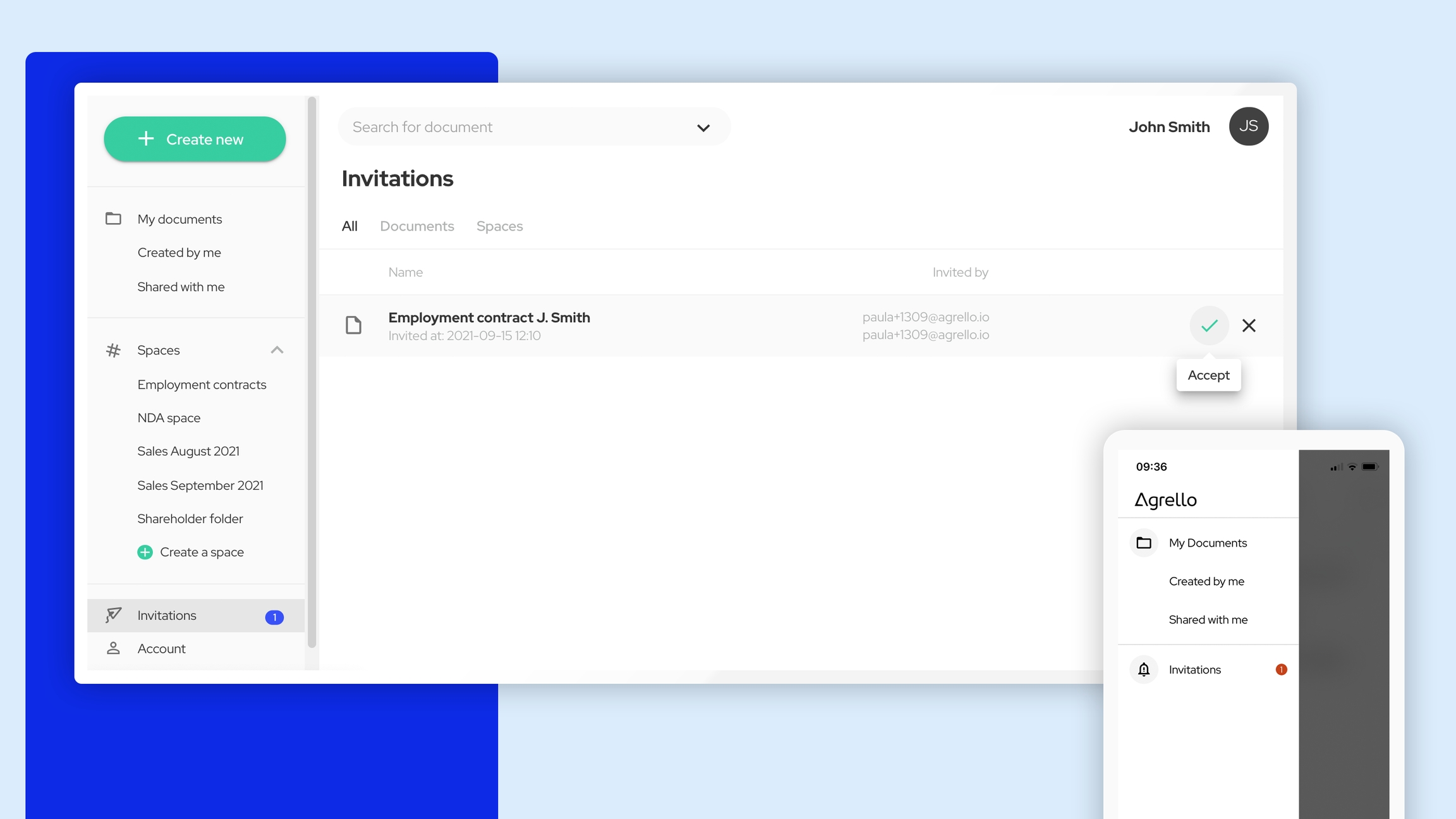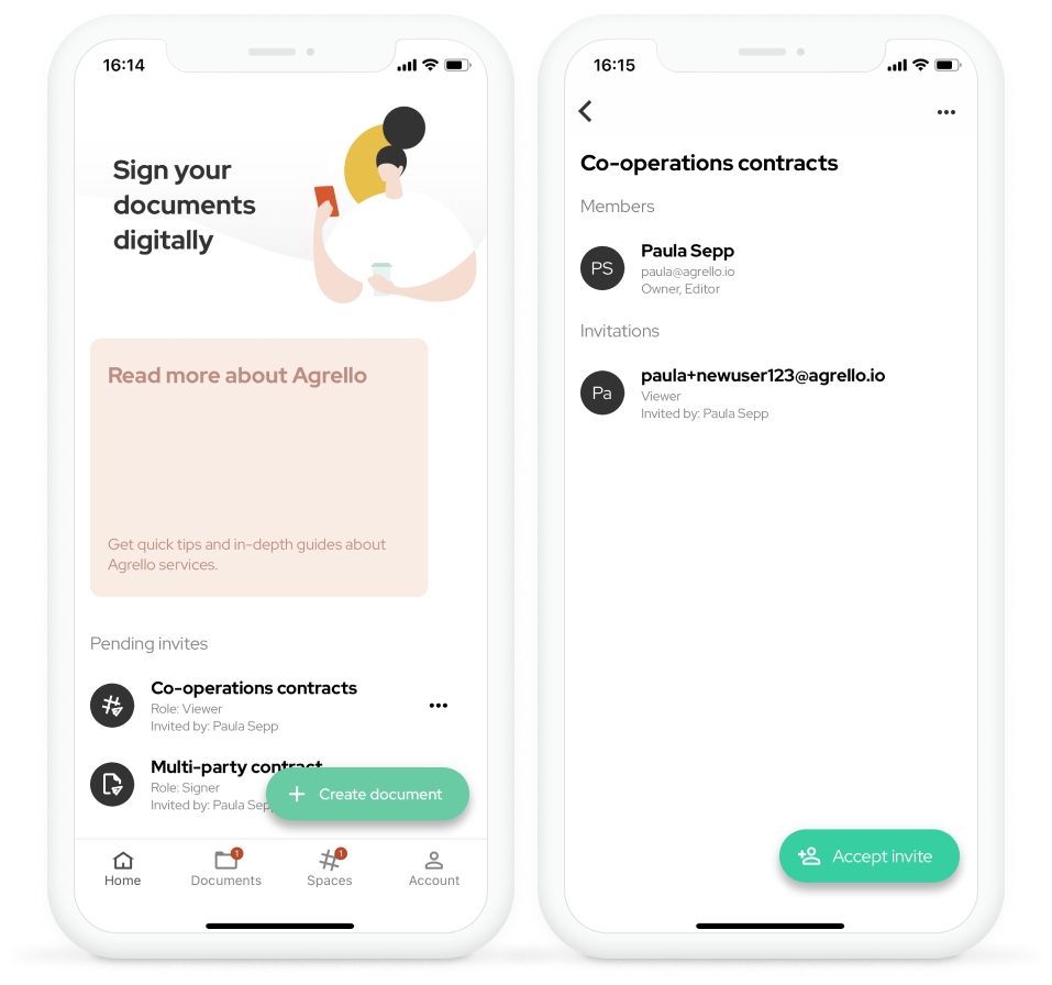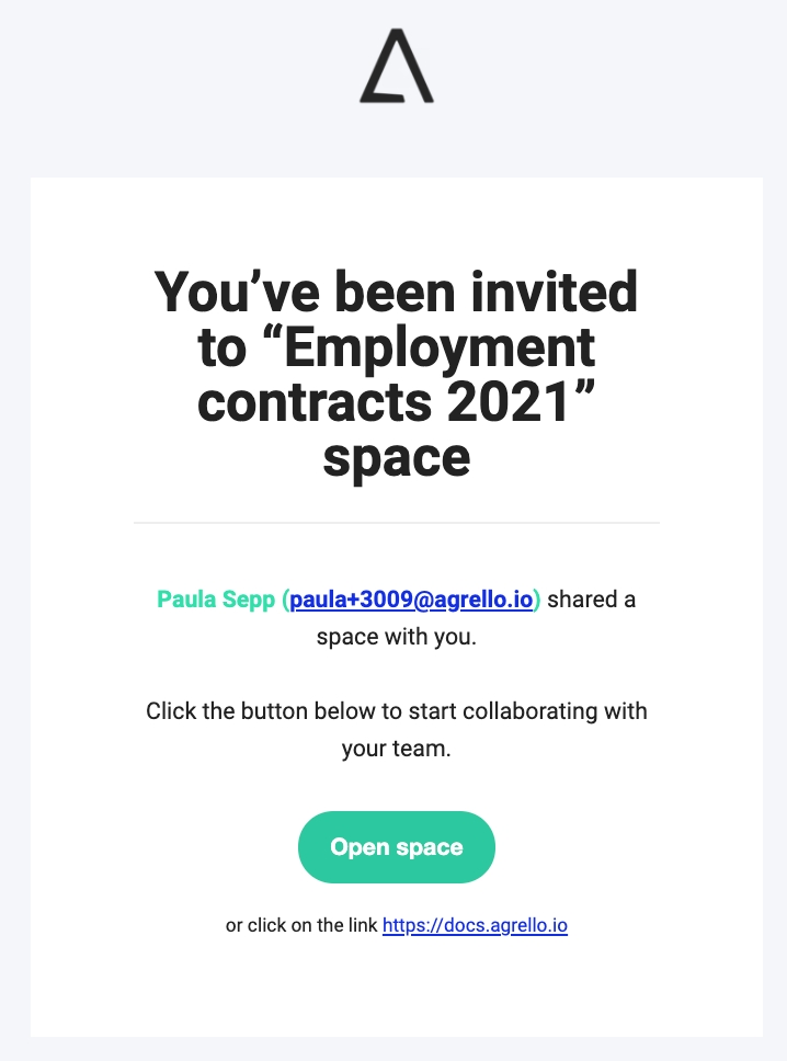 You will be notified by a new space invitation via email with a direct link to the space. To avoid spamming and unwanted documents or spaces ending up on your account we have introduced an invitations logic that requires you to accept or decline the invitation before you become a member of that space.
