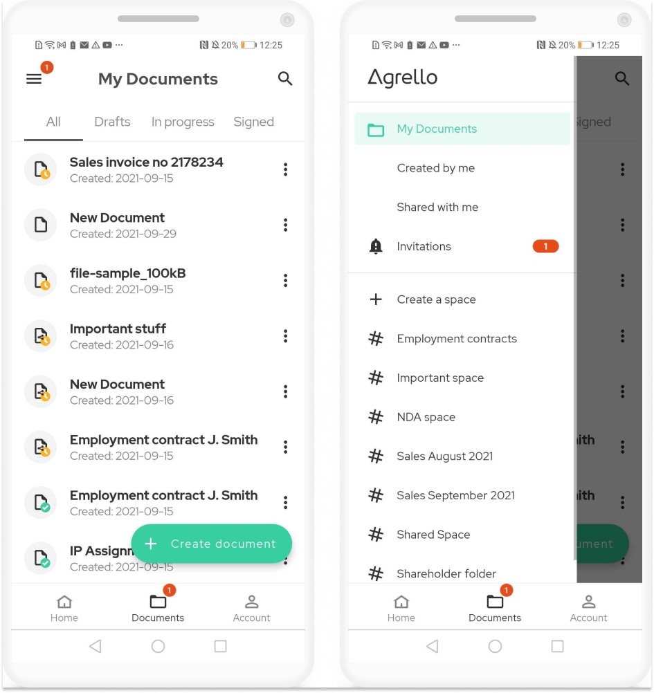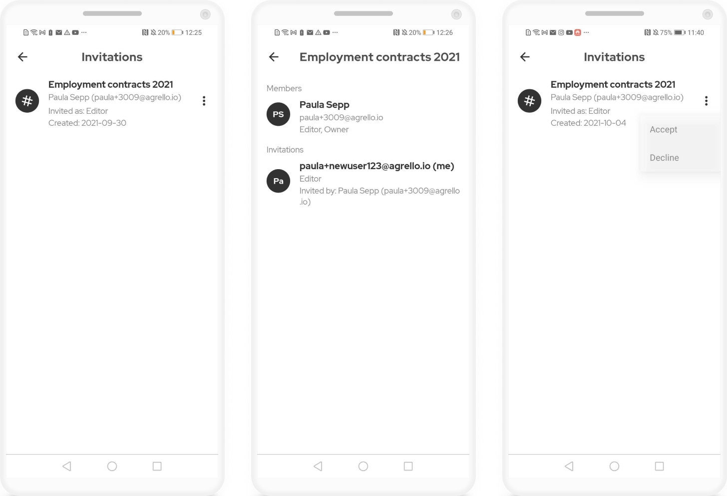 On Android mobile app you will see a red notification behind Documents tab and inside your documents also behind the hamburger menu at the top left corner. Click on invitations menu to open the invitation. Click on the space name to see who else is collaborating on that space. Go back and click on 3-dots button to accept it. Now you will see all the documents listed in that space.