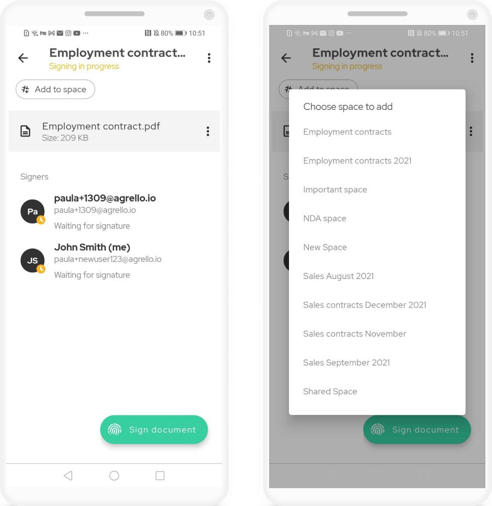 To add an existing document to space on Android mobile app you need to open the document and press the button # Add to space → choose a space from your list of spaces and click on it → the document is added to space. All the spaces your document belongs to are visible at the top of the screen under your document name and signing status. One document can belong to multiple spaces, so pick as many as you like!