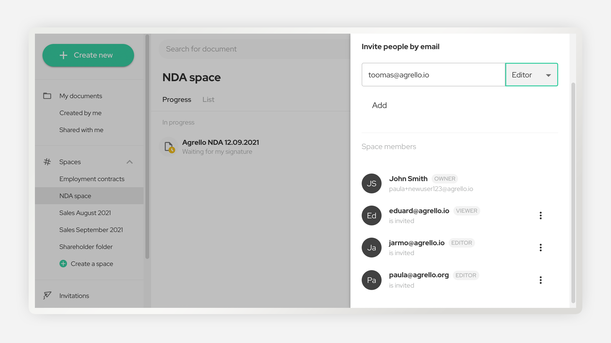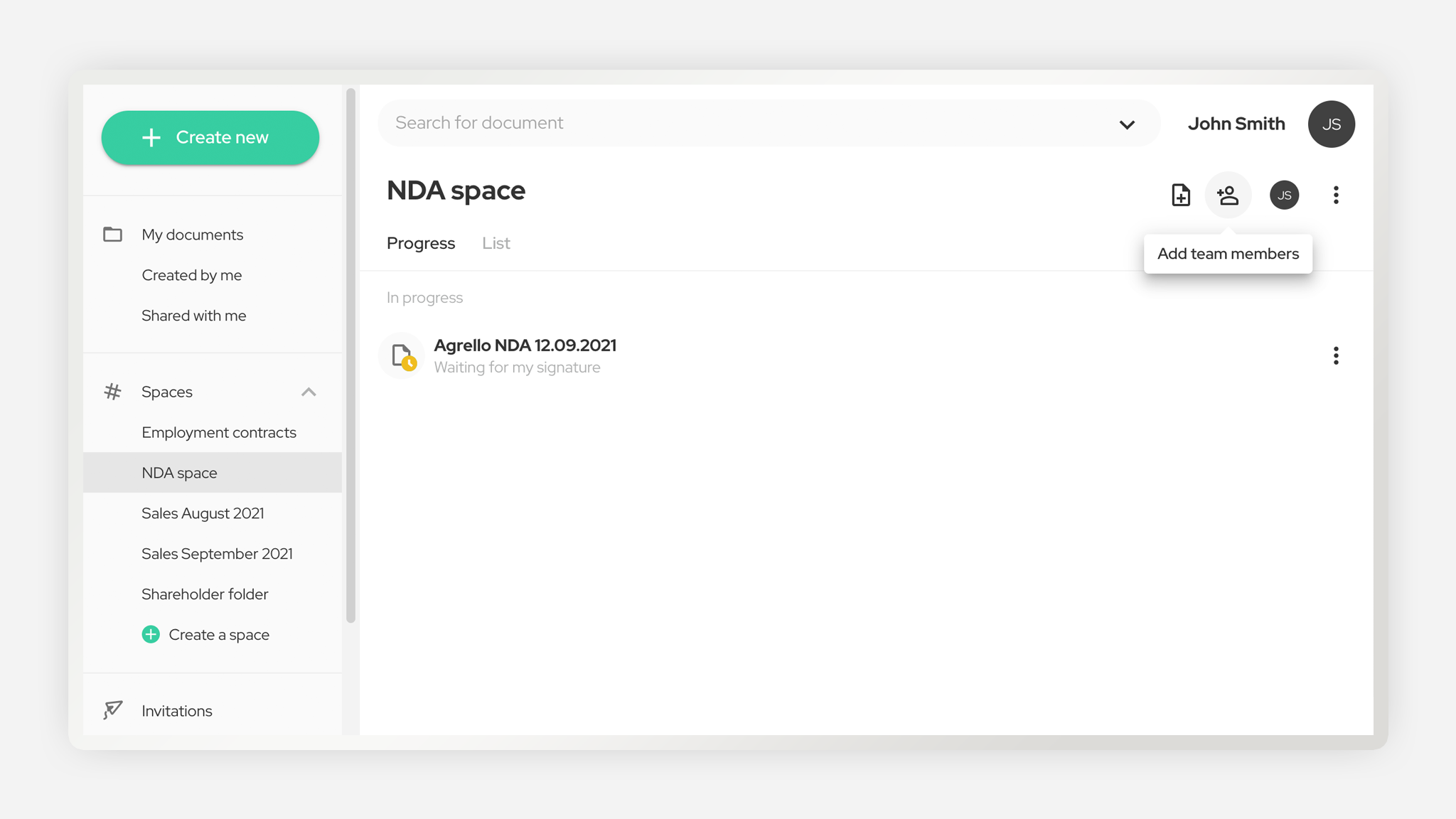 It is possible to create shared spaces with your coworkers and business partners by inviting them to your space. That way you have a nice co-working space, where everyone can keep track of all relevant documents and their signing status.