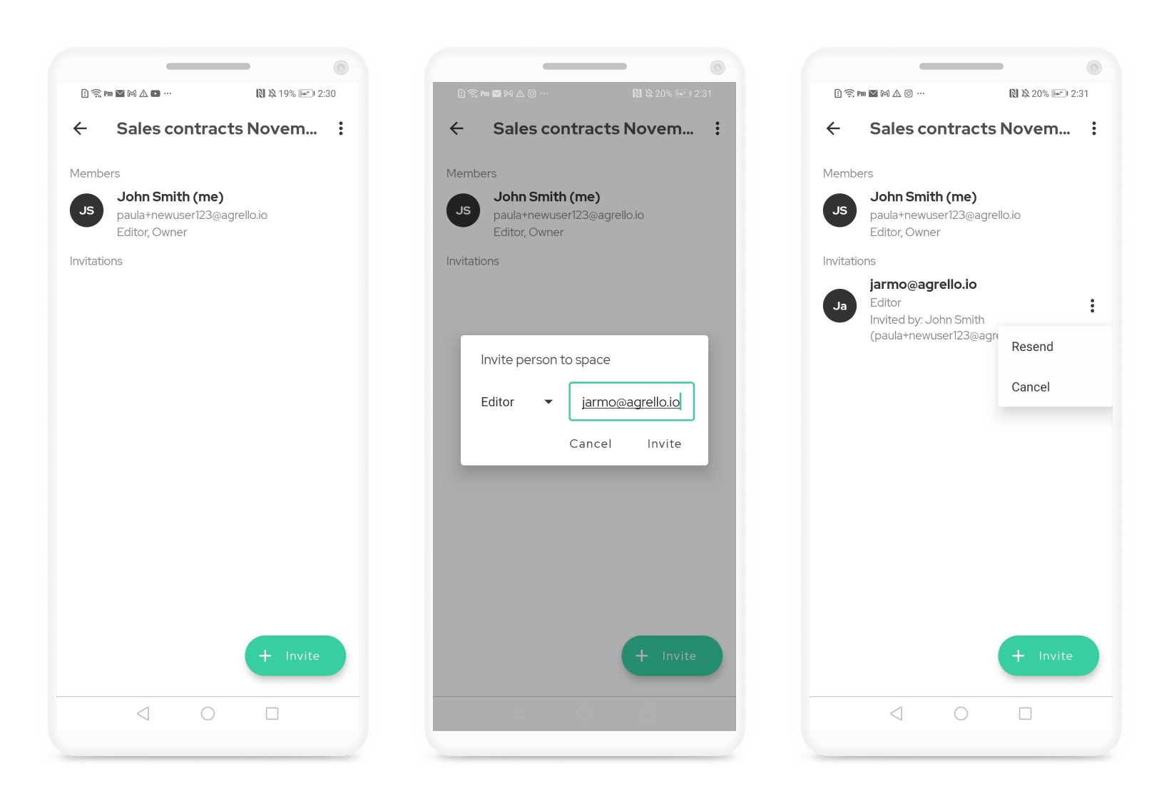In Android mobile app you an invite others by opening the detailed view of the space by clicking on 3-dots button and pressing the button Invite. Enter the email of your colleague or business partner and choose a desired role for them, press Invite button and the invitation is on its way! You can resend an invite anytime necessary by pressing the 3-dots button → Resend.