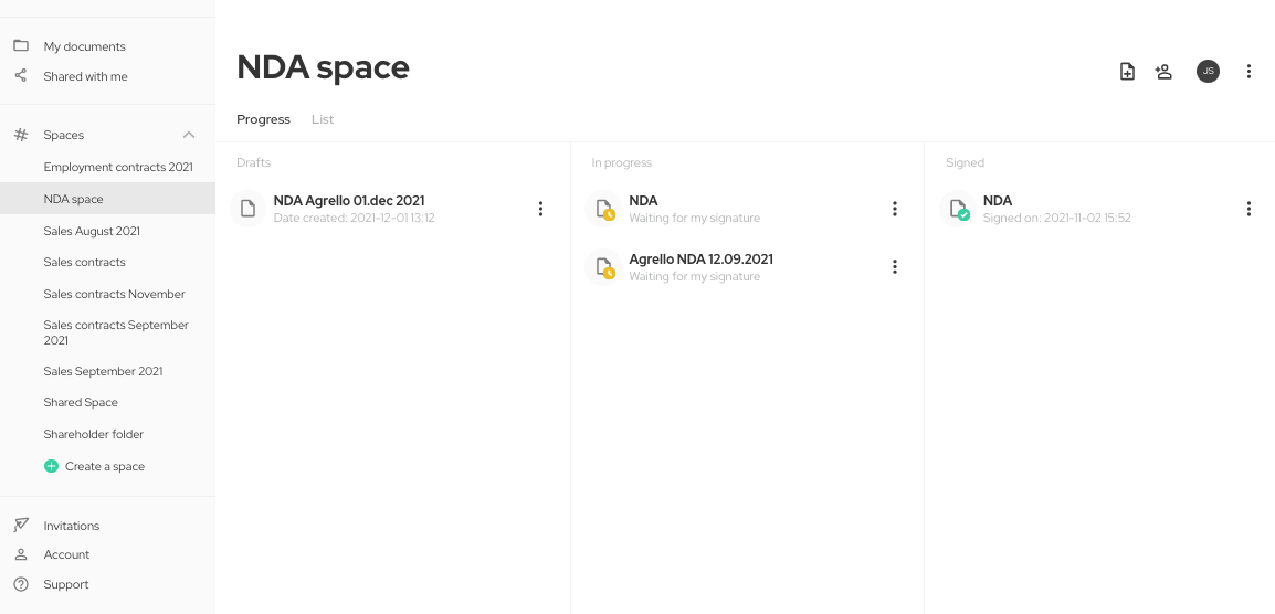 Each Space has a built-in KANBAN-like board that divides documents into Drafts, In Progress, and Signed based on their signing status. That's what Spaces is all about - giving you a better overview of all your documents and giving you the freedom to organise.